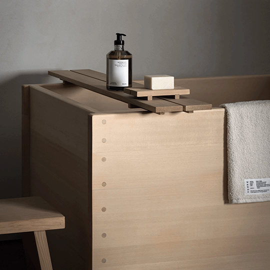The centrepiece of the range is the fully custom Hinoki bathtub, handcrafted for us in Japan in the tradition of the ofuro.