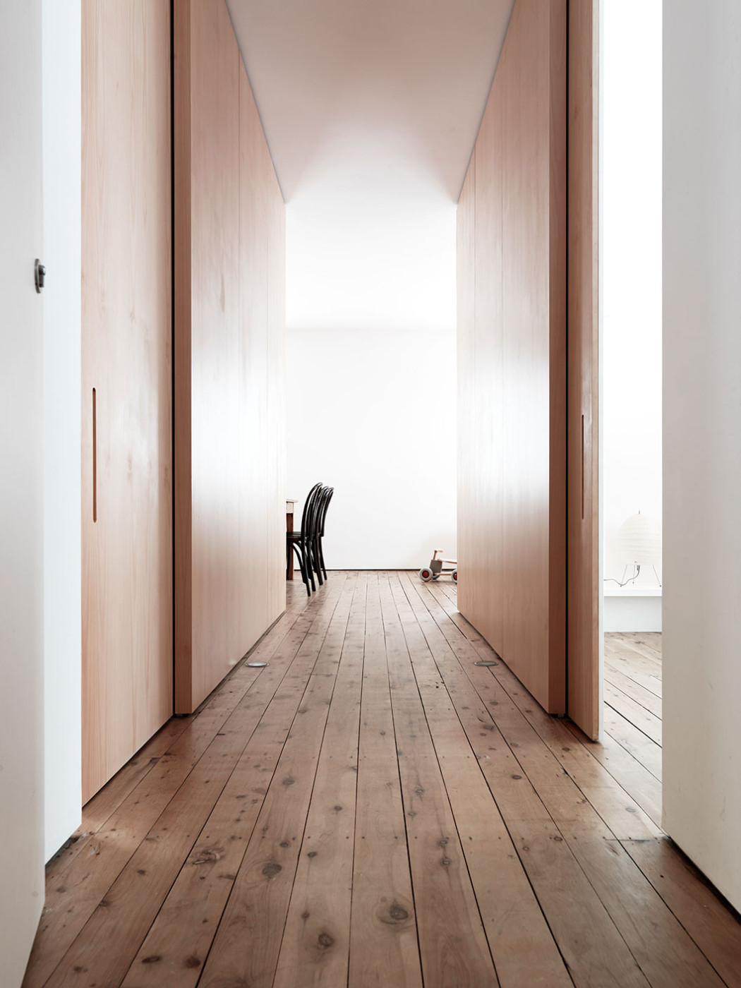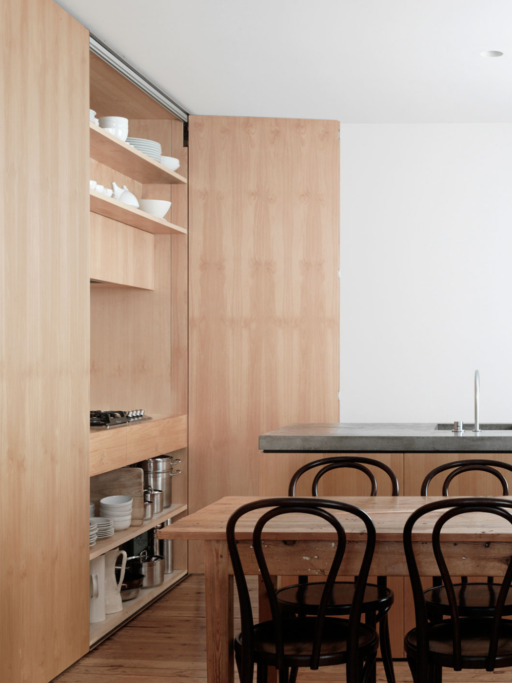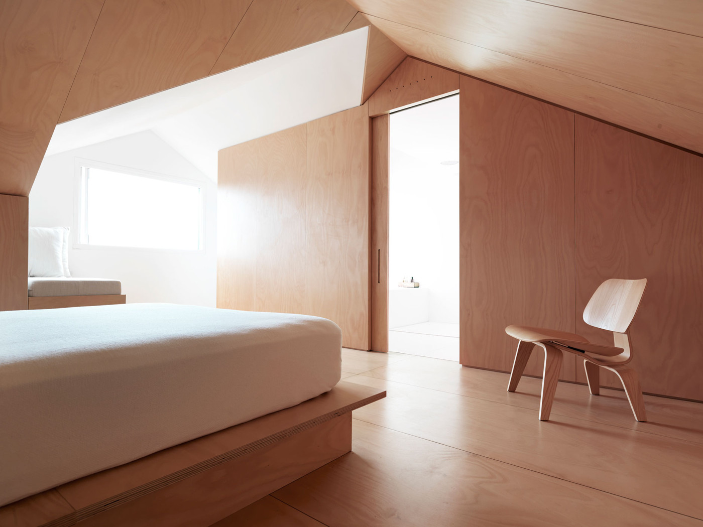 Re-engineering of this top-floor apartment saw all interior walls removed within the existing 68 square-metre envelope. Roof space was lined for the new master bed and bathroom, and a cost-effective palette of plywood, lovingly crafted, used to organise the downstairs space and harmonise with original elements for a light, contemporary home.
