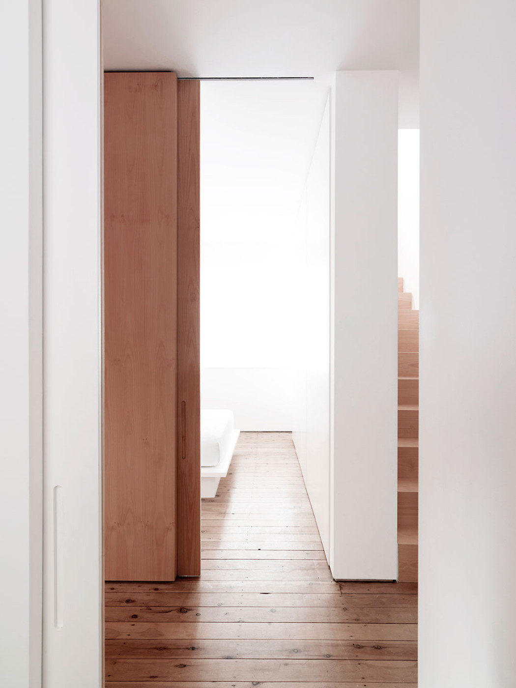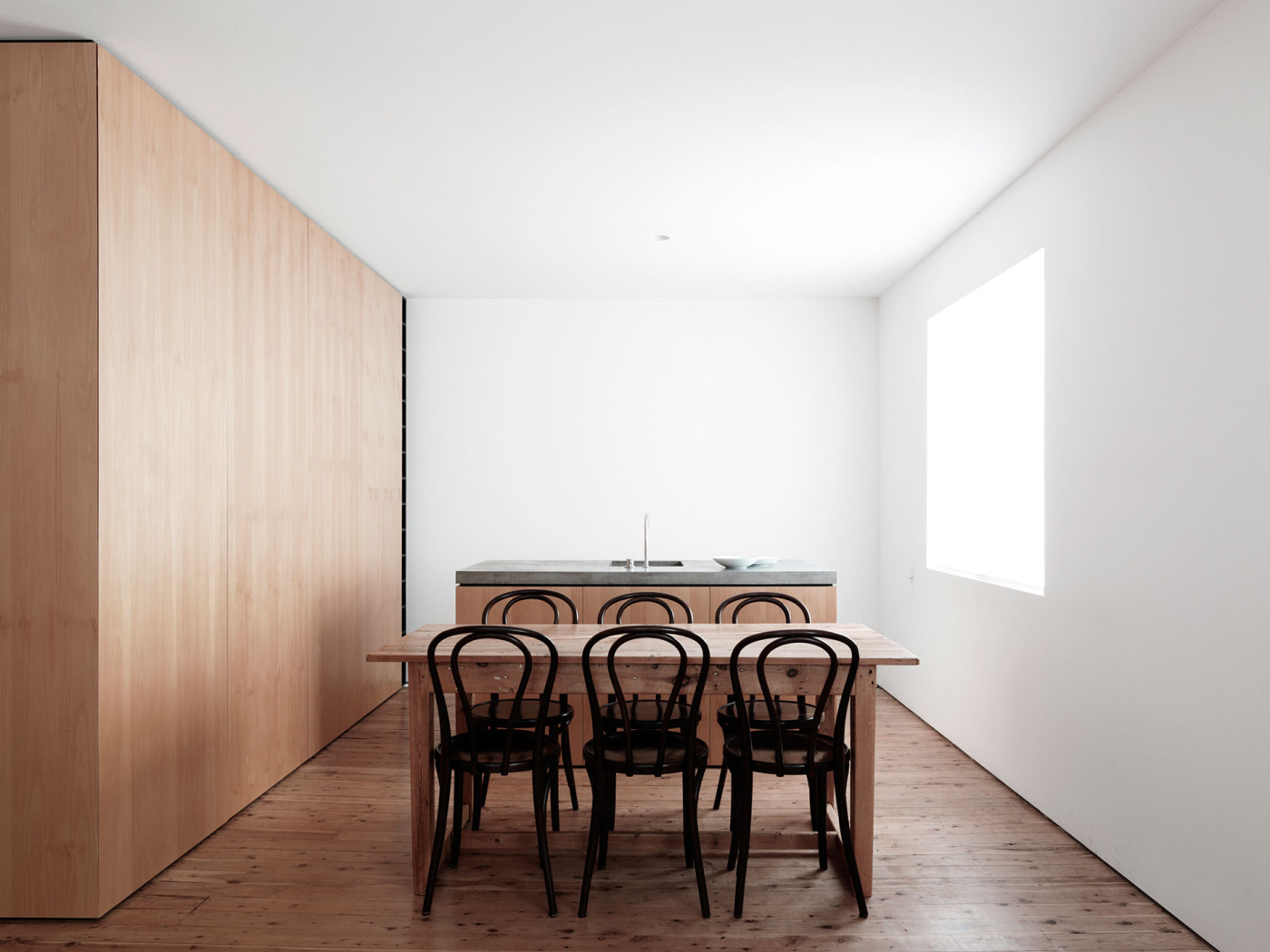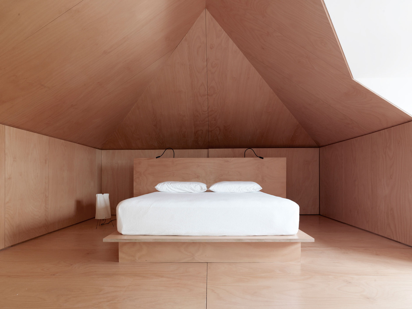 Re-engineering of this top-floor apartment saw all interior walls removed within the existing 68 square-metre envelope. Roof space was lined for the new master bed and bathroom, and a cost-effective palette of plywood, lovingly crafted, used to organise the downstairs space and harmonise with original elements for a light, contemporary home.