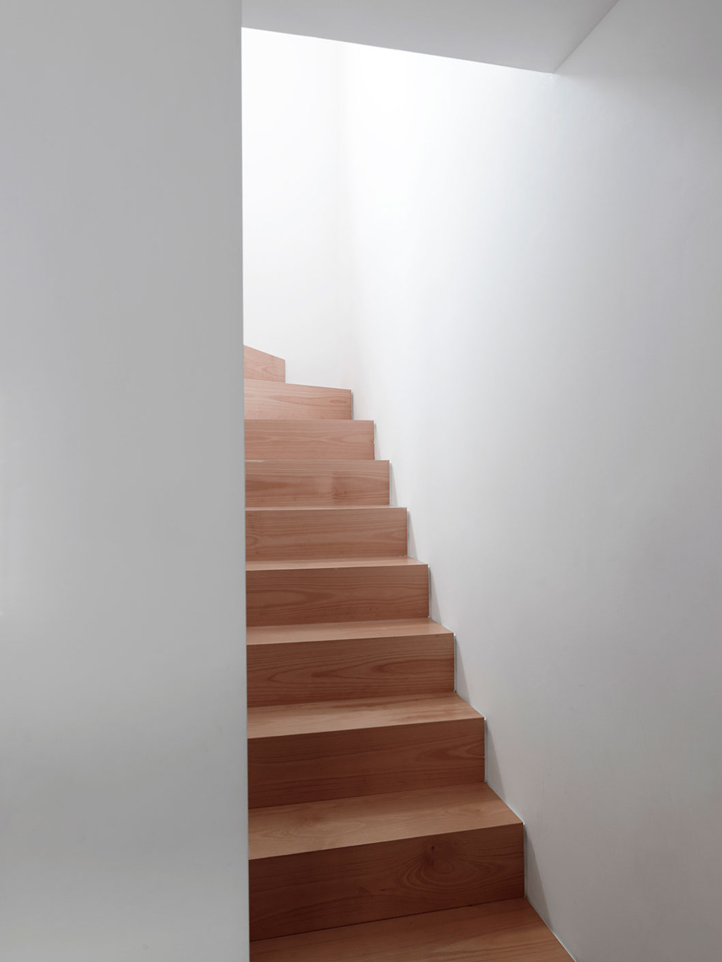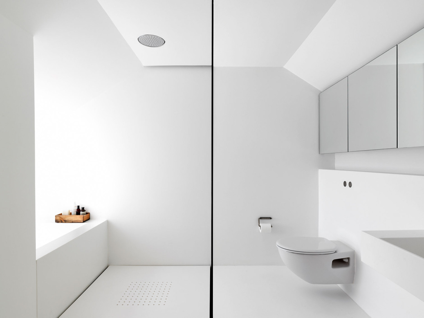 Original pine floorboards were bleached and sliding sash windows were replaced with cedar-framed pivoting panels to open more generously to the light, street and district views. Two white bathrooms were added: one downstairs, one in the attic where a white egg-shaped bathtub tucked into the window looks out to sea.