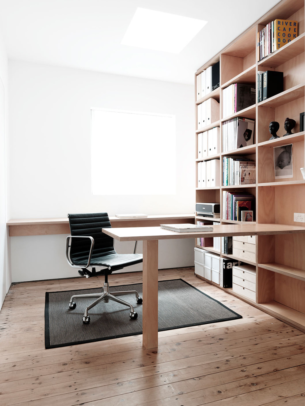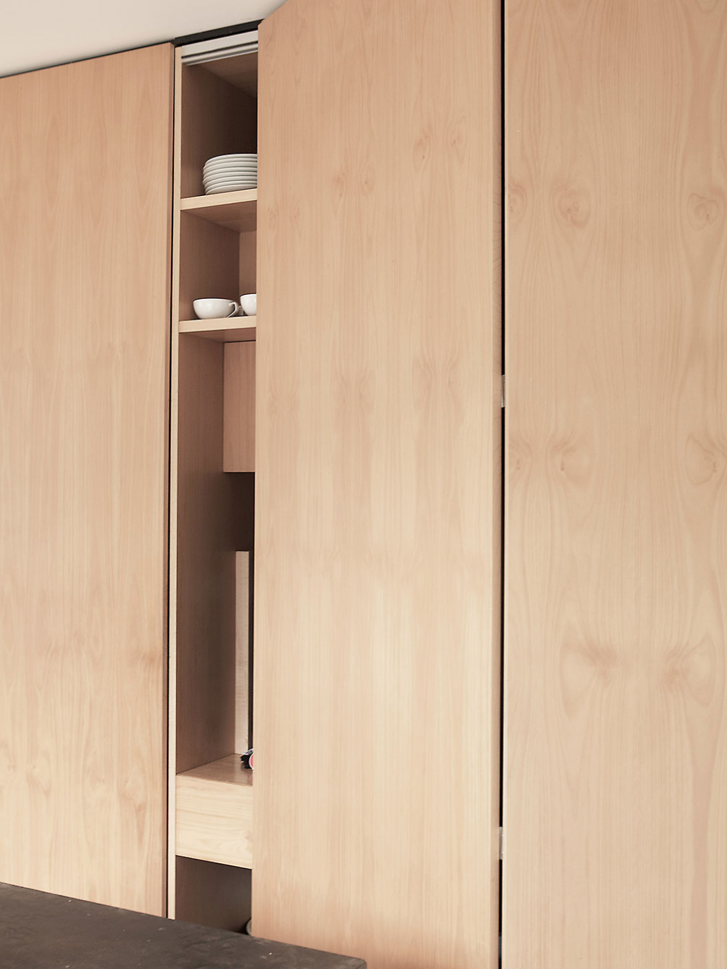 For the bedroom and study, two plywood pods were inserted either side of the entry, separated by a central passage leading to the open-plan living area. Lounge, TV and play space are at to side, with kitchen / dining to the other. All kitchen services and storage are concealed in doors at the back of one pod, while TV, toys, books and more are stored in cupboards behind the second pod.