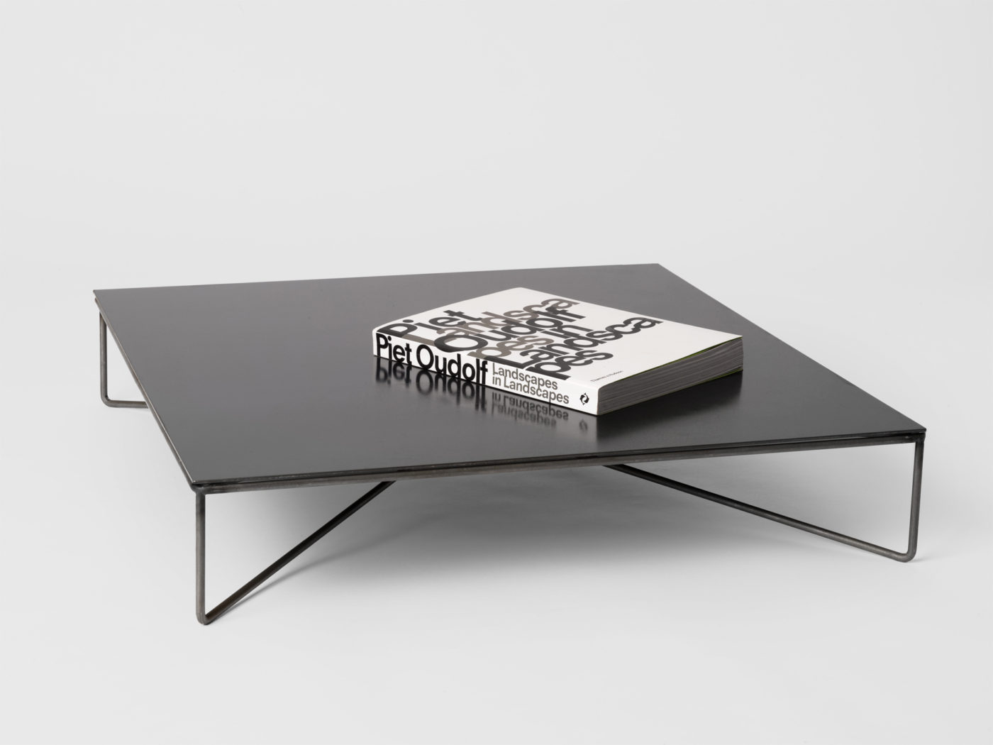 A functional piece for home or studio, it’s designed as a low mantle for open books or display. The fine steel rod base is inspired by the continuous loop of a bow-tie. With no visible end or connection points, its two intersecting steel cords touch the ground as corner leg supports. The original top is black steel clear-waxed, but alternate tops of timber or stone can be made.