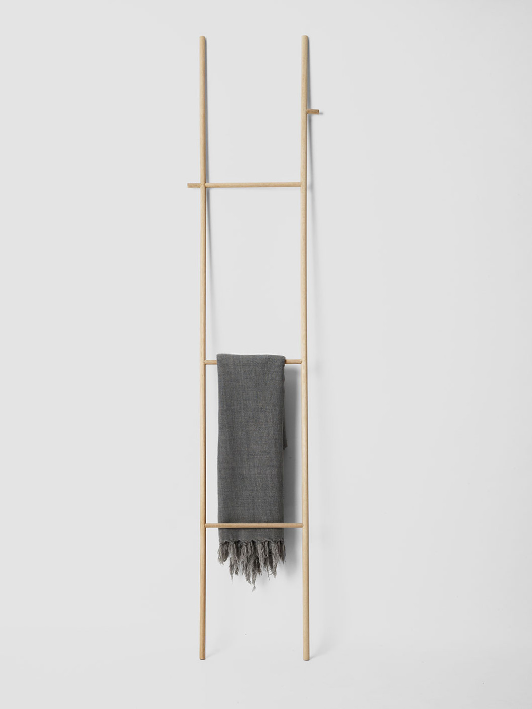 A fun piece to rest against wall or window, this fine towel ladder is made of Beech dowel, rubbed with a natural soap mixture to achieve a light matt protective finish. The top rung and one dowel extend beyond the risers in counterbalance, creating little hooks that playfully animate the ladder. The strength of the Beech hardwood allows a finer dowel, and an elegant silhouette.